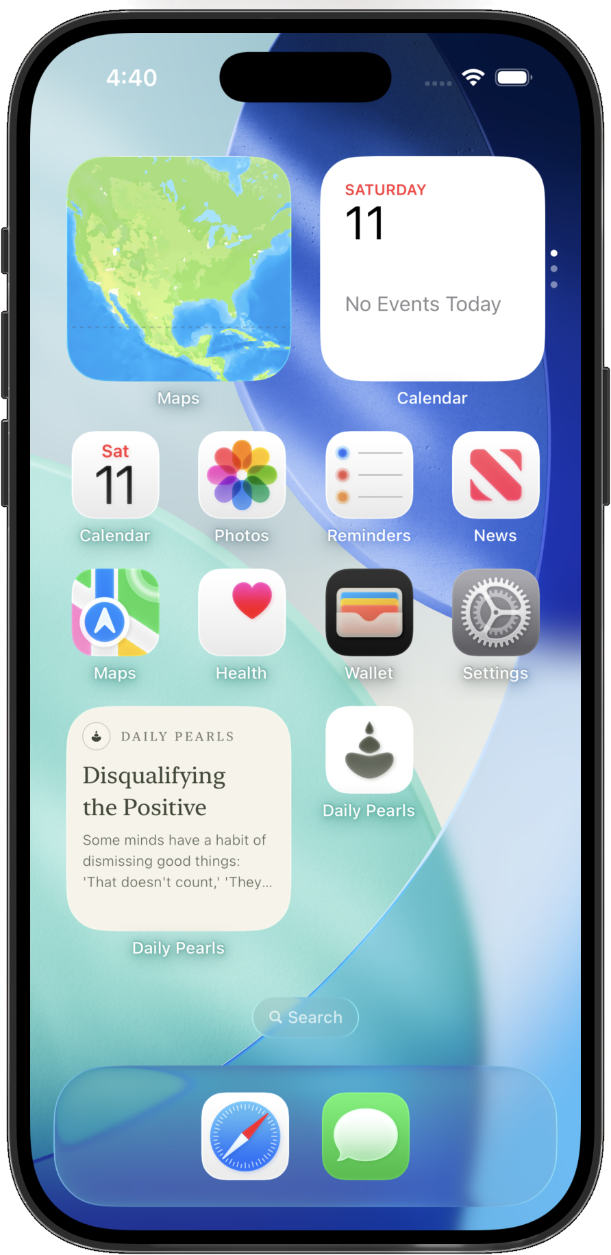 Daily Pearls delivers a single, warm prompt to your device every day. You can receive it via a gentle morning notification, or view it natively on your iOS Home Screen for a glanceable moment of calm using our dynamic widget.